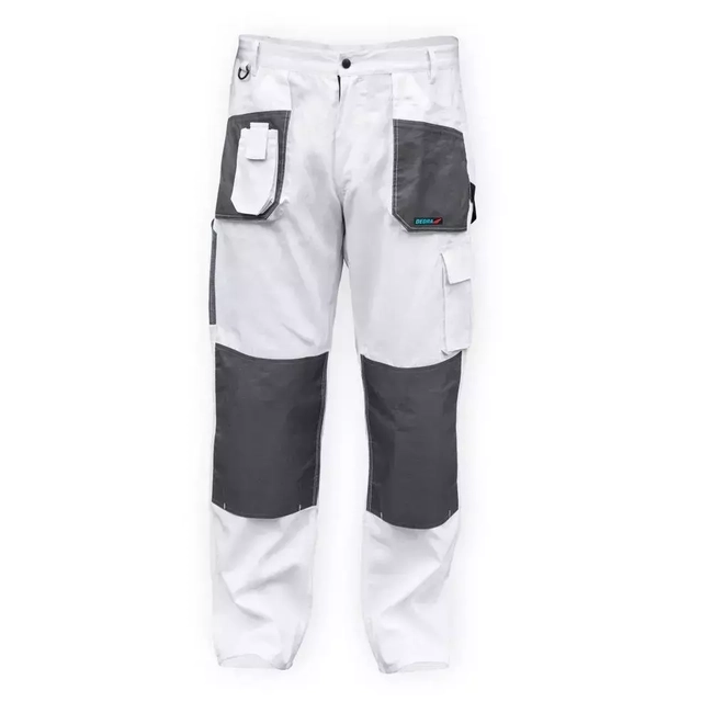 Bezpečnostní kalhoty WHITE LINE jsou vyrobeny ze směsi polyesteru a bavlny. Tento materiál o gramáži 190 g/m2 zajišťuje dobrou cirkulaci vzduchu a volnost pohybu. Další výztuhy na kolenou. Funkční kapsy včetně kapsy na smartphone. Trojité švy zvyšují odolnost kalhot. Díky bílé barvě jsou kalhoty vhodné zejména pro malíře a štukatéry. Ideální pro teplé dny.