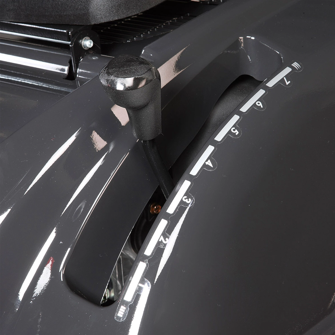 Praktická páka v dosahu s odstupňovanou stupnicí pro okamžitou vizuální kontrolu požadované výšky sečení.