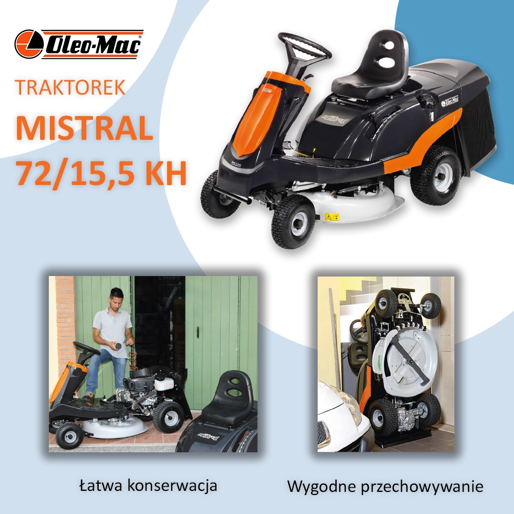 Zahradní traktor OLEO-MAC MISTRAL 72/12,5 KH představuje novou generaci sekaček s pojezdem Oleo-Mac. Jsou vybaveny všemi nejmodernějšími řešeními pro optimalizaci. Komfort a výkon jsou ideální odpovědí na potřeby nejnáročnějších uživatelů, kteří i ve velmi stísněných prostorách hledají jednoduchou manipulaci, vysokou kapacitu sběru a dlouhou autonomii provozu.