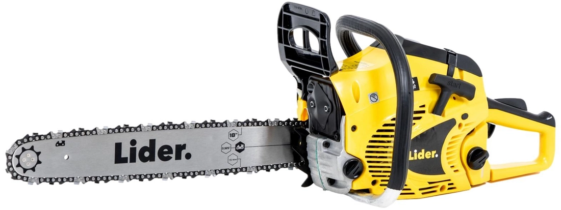 Benzínová řetězová pila Lider RG5318-B4 je model určený typicky pro práci na zahradě, jako je řezání polen, větví nebo dřeva - intenzivnější, profesionální a komerční použití se nedoporučuje, pokud máte obavy o bezpečnost a životnost stroje. Zařízení je poháněno dvoutaktním spalovacím motorem o objemu 53 cm3 a výkonu 2,7 k. Je vybaven vodicí lištou o délce 45 cm a řetězem 72E o průměru 0,325 1,5 mm. Má také automatické mazání řetězu. Antivibrační systém je navržen tak, aby zlepšil komfort obsluhy a snížil míru únavy způsobenou dlouhodobým používáním stroje. To je dále ovlivněno relativně nízkou hmotností pily (5,1 kg). Benzínová řetězová pila Lider RG5318-B4 má také bezpečnostní prvky v podobě ochranného krytu rukou proti řeznému prvku a brzdy řetězu. K dispozici je také palivoměr.