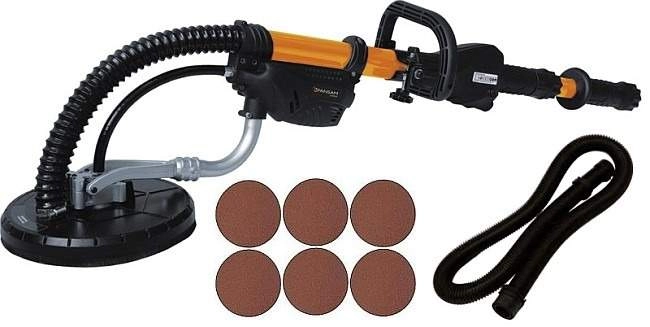 BRUSKA NA SÁDROKARTON GYRO PANSAM A142210 je technologicky vyspělý výrobek určený k broušení sádrokartonových stěn a stropů pokrytých sádrokartonem. Konstrukce brusky zahrnuje systém odsávání prachu. Připojením brusky k průmyslovému vysavači lze výrazně omezit šíření prachu během provozu. Vysavač není příslušenstvím stroje. Bruska je je vybavena výsuvným ramenem, umožňuje obsluze provádět broušení povrchů stěn a stropů v rozmezí do 3,0 - 3,5 m . Pohyblivá (otočná) hlava stroje umožňuje provozovat výložník na libovolné stěně, stropě nebo dokonce na podlaze. Použití vhodné zrnitosti brusného papíru umožňuje také odstraňovat nátěry nebo lepidla z omítek a kovových povrchů. Broušené plochy musí být suché.