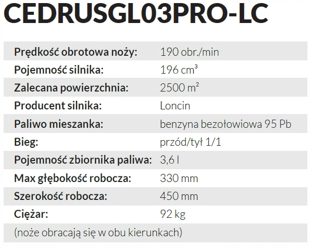 Půdní kultivátor CEDRUS GL03PRO-LC je univerzální a všestranný kypřič půdy s nezávislým pohonem kol. Určeno pro použití na zahradách, ve fóliových tunelech, sklenících a na farmách s řádkovými plodinami. Pohon kol poskytuje vynikající odpružení síly přenášené pracovními noži, snižuje pracovní úsilí a umožňuje důkladné nakypření půdy při prvním pracovním přejezdu. Kola také usnadňují převážení stroje na pracoviště, které je u tohoto kypřiče půdy lehké a efektivní. Vybavení GL03PRO-LC s výkonným a spolehlivým motorem Loncin, zpětný chod nebo nastavitelná pracovní hloubka, dělá z kypřiče půdy vysoce výkonný stroj. Příprava půdy nebo kultivace se s jeho pomocí stává snadnou, rychlou a příjemnou. CEDRUS GL03PRO-LC - je profesionální půdní kypřič - s funkcí změny směru otáčení nožů během práce
