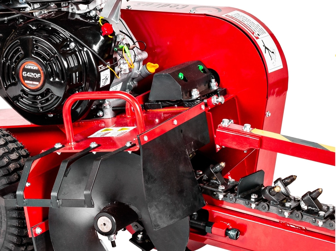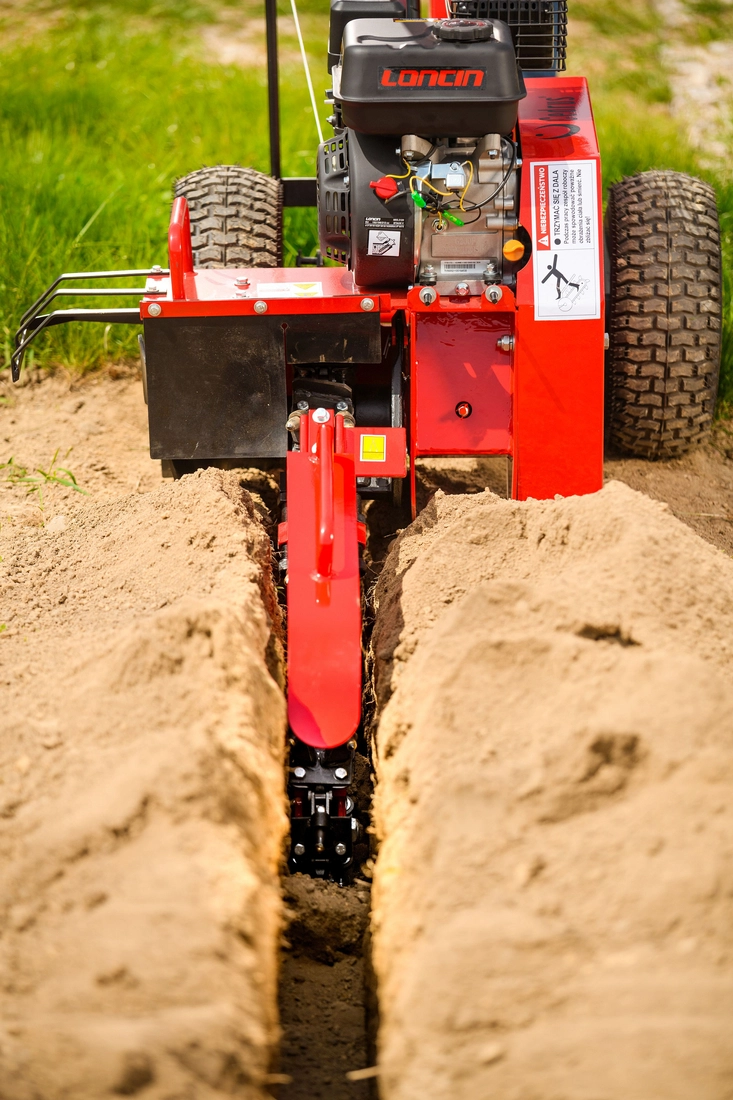 Mini zahradní řetězové rypadlo Cedrus KP01 je poháněno výkonným a efektivním motorem Loncin G420F. Rypadlo je vybaveno 2000 mm dlouhým řetězem s 27 spékanými zuby a šnekem k ukládání zeminy vedle výkopu. Řetězové rýpadlo může hloubit ve 3 různých hloubkách: 20 cm, 40 cm, 60 cm. Během provozu řetězu lze natírat pojezdová kola. Výkon řetězového rýpadla CEDRUS KP01 DR-TR-15 závisí na půdě, ve které pracuje, a může dosahovat až 60 m/h.Je to ideální zařízení upraveno pro zahradní a krajinářské práce např. zavlažovací systémy nebo instalace žacích robotů.