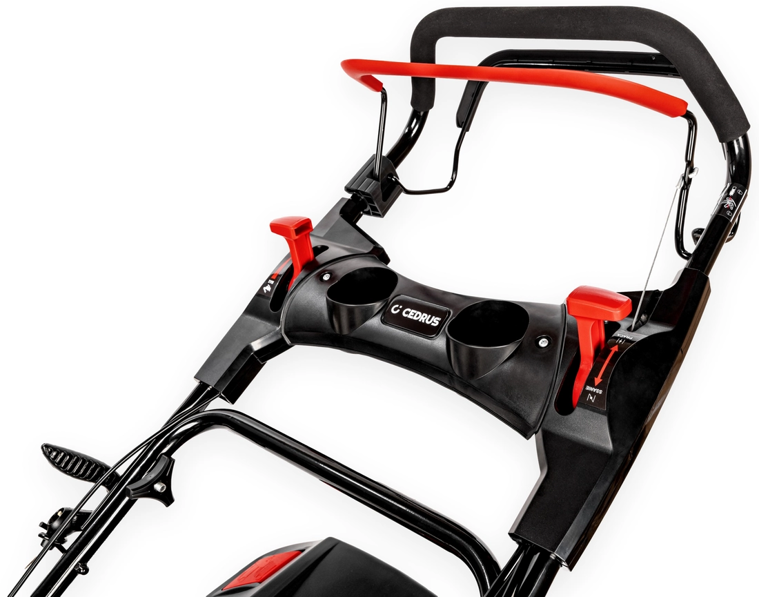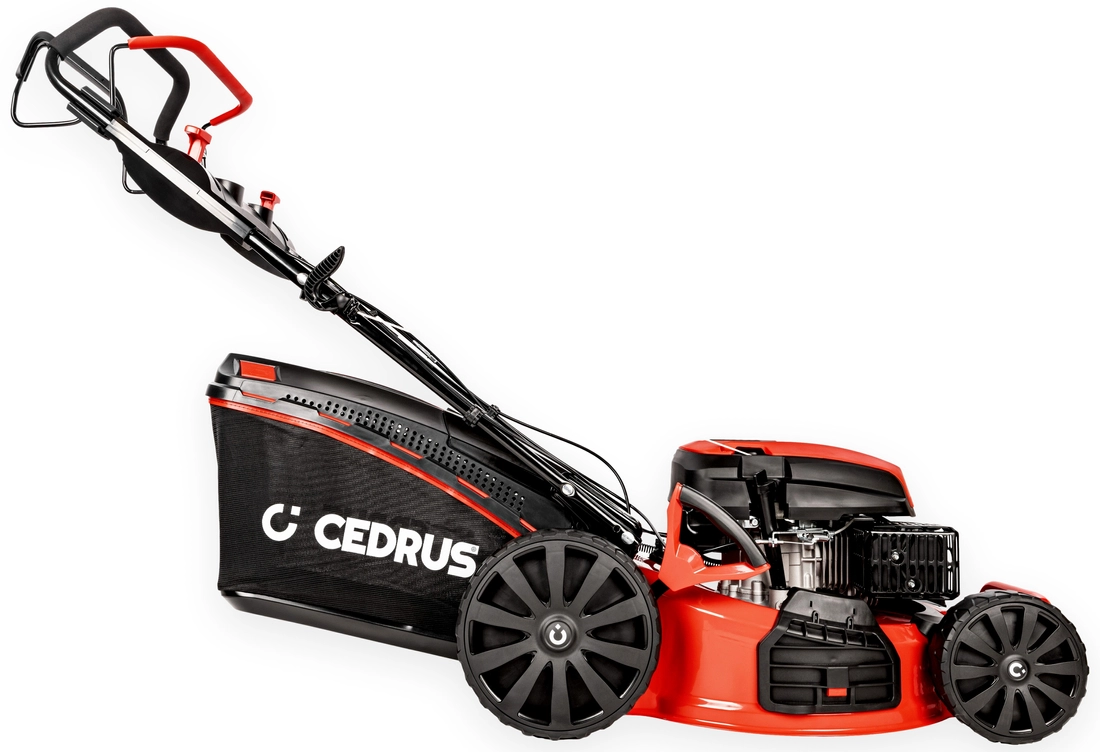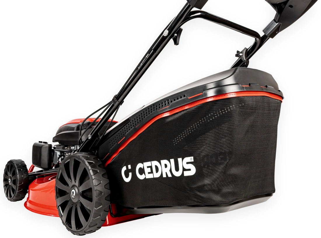 Sekačka na trávu Cedrus KS53S je model vybavený pohonem. Všechny komponenty našich nových sekaček řady KS byly pečlivě vybrány a testovány, aby si každý uživatel mohl vychutnat jejich spolehlivost a kvalitu. Sekačka KS53S má motor o výkonu 4,2 kW při 2800 ot/min, koš o objemu 65 litrů s ukazatelem stavu naplnění, centrální nastavení výšky sečení, přípojka pro čištění podvozku sekačky. Kryt sekačky je vyroben z oceli a jeho pracovní šířka je 53 cm. Na rukojeti jsou dvě páky, jedna slouží k nastavení otáček motoru, druhá je páka sání. Držák je také vybaven držákem na nápoje. Snadné manévrování zajišťují velká zadní kola a dobré vyvážení stroje. Všechna kola mají ložiska.