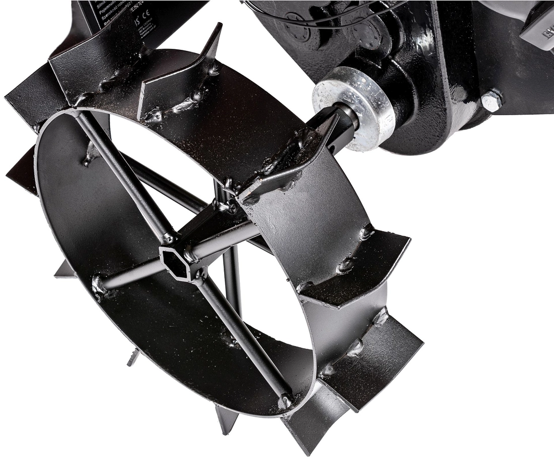 • Pohon kol zajišťuje, že se stroj neotřásá, dokonale tlumí síly přenášené pracovními noži, snižuje pracovní úsilí a umožňuje důkladné nakypření půdy při prvním pracovním přejezdu.