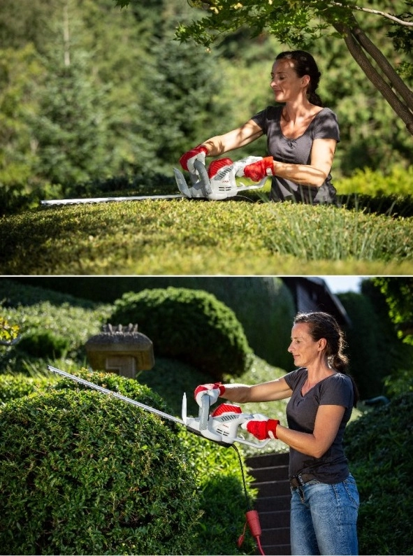 Elektrické nůžky na živý plot lze používat nepřetržitě, protože energie je nepřetržitě dodávána z elektrické zásuvky. Díky externímu zdroji energie jsou elektrické nůžky výrazně lehčí než benzínové. Energie dodávaná ze zásuvky také znamená, že nemusíte dbát na dobu nabíjení baterie. Nebude docházet ani k přerušení plnění nádrže a přípravy směsi. Elektrické nůžky na živý plot IHT 550 mají kovovou převodovku což zajišťuje spolehlivost a trvanlivost zařízení. U živých plotů rostoucích u zdi se nemusíte bát, že byste špičkou nožů narazili do zdi a poškodili nůžky, protože jsou vybaveny ochranou proti nárazu ochranou čepelí namontované na jejich špičce. Tím je zajištěno, že dotykem špiček nožů se stěna nepoškodí, a je zabráněno vychýlení nůžek pohybujícími se noži. Kryt hrotu nože má 3 důležité funkce: chrání obsluhu před zpětným rázem nože, chrání nože před poškozením a chrání stěnu před poškozením.