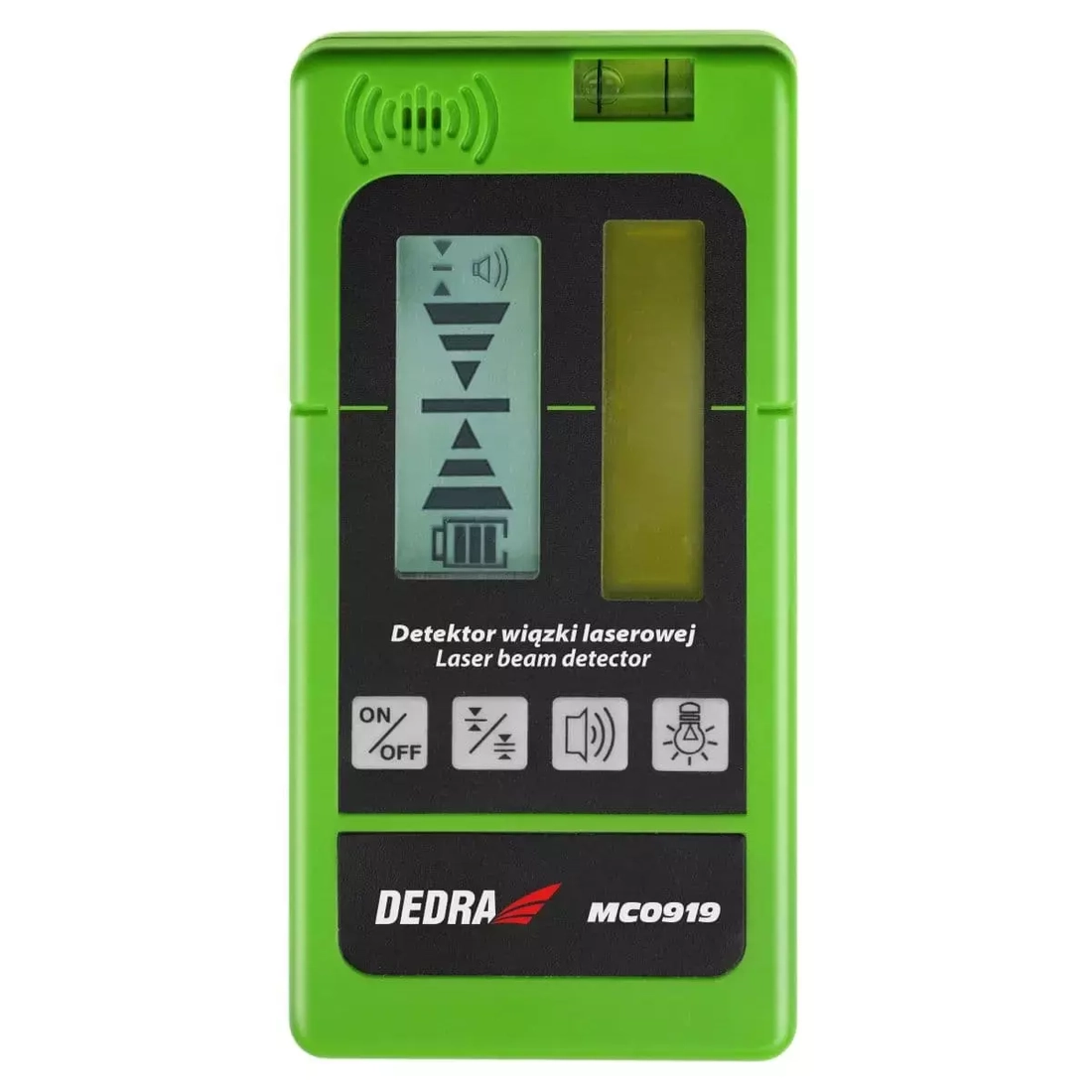 Detektor laserového paprsku má vestavěný reproduktor se dvěma zvukovými tóny, které fungují jako "bzučák", tj. zvukový signál při detekci paprsku. Detektor pracuje se zelenými laserovými paprsky, např. DEDRA MC0903, MC0904, MC0905, MC0906, a také s červenými, např. DEDRA MC0901. Obsluhu přístroje usnadňuje snadno čitelný displej s podsvícením, rukojeť pro upevnění na hůl a 1/4" závit pro připevnění stativu.