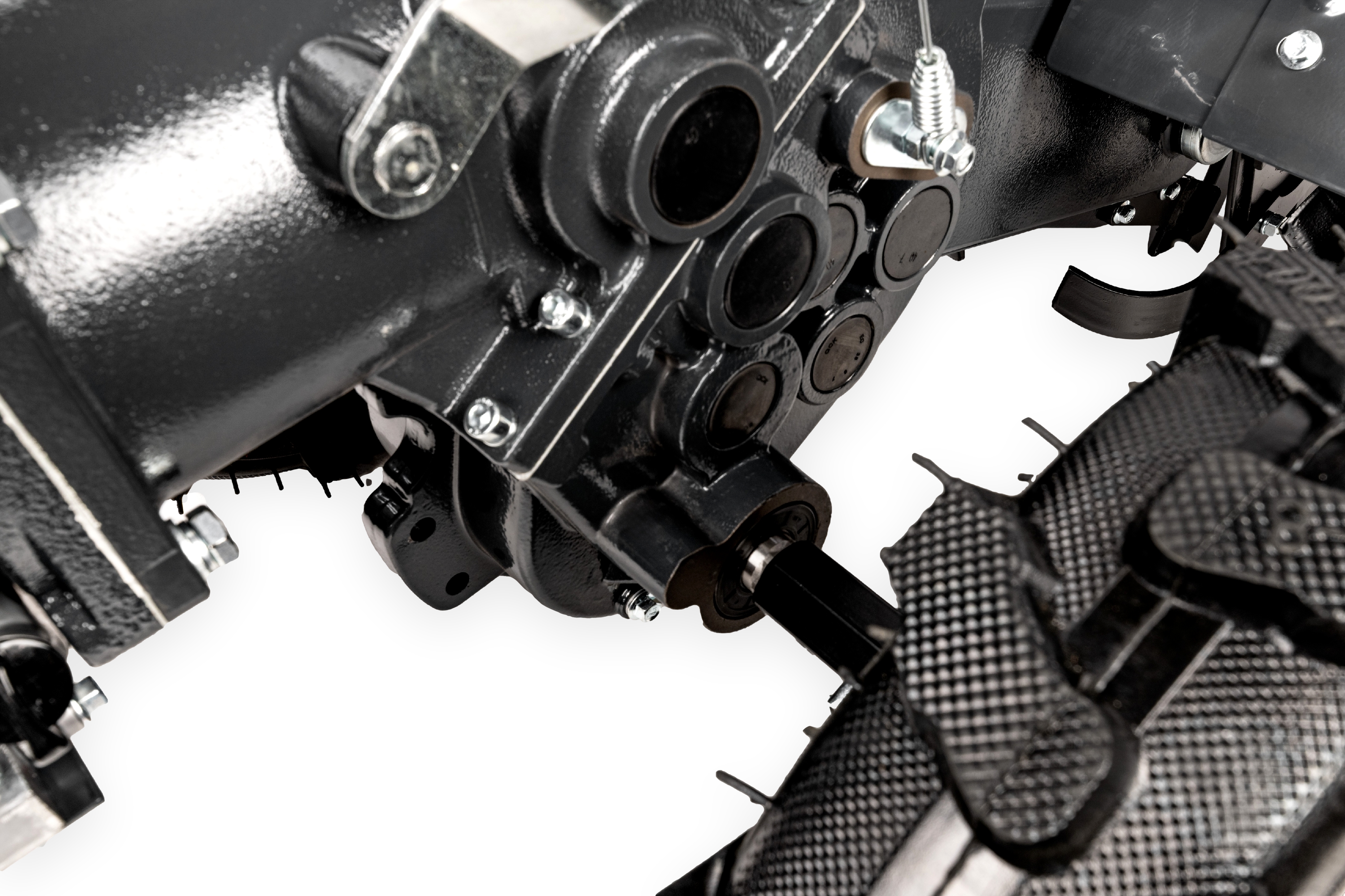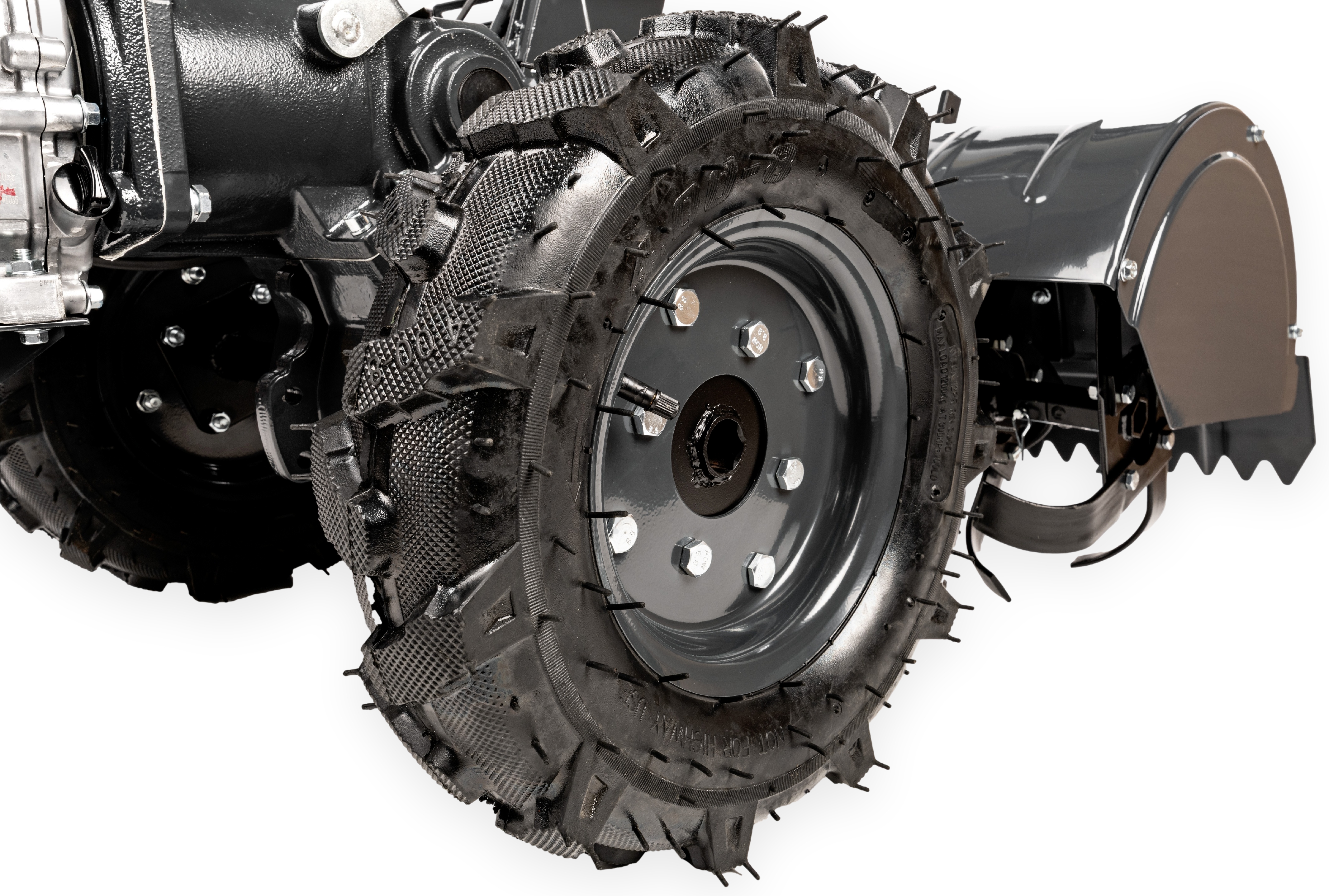 - Pohon kol zajišťuje, že se stroj neotřásá, dokonale tlumí síly přenášené pracovními noži, snižuje pracovní úsilí a umožňuje důkladné nakypření půdy při prvním pracovním přejezdu.