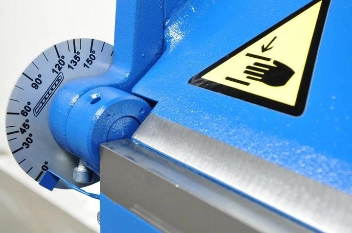 The bending operation is carried out by rotating the bending beam by a certain angular value using a handle. Angle gauge mounted on the left side of the bending machine when viewed from the front indicates the current angle of the sheet metal bend.