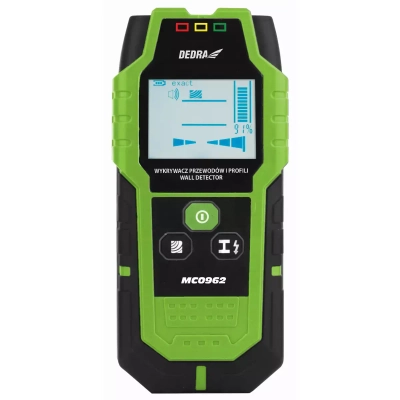 DEDRA MC0962 wire and profile detector allows detection of metal parts and profiles, electrical wires without and under AC voltage, and wood. Thus, it helps to complete the technical documentation of buildings. High-sensitivity sensor and clear display indications, allow to locate the searched element more precisely, this minimizes the risk of drilling through the pipe or electrical harnesses. In addition, the cable detector has an audible signal so you won't miss an alert. Included with the device you will find a carrying case, belt holder and instruction manual.