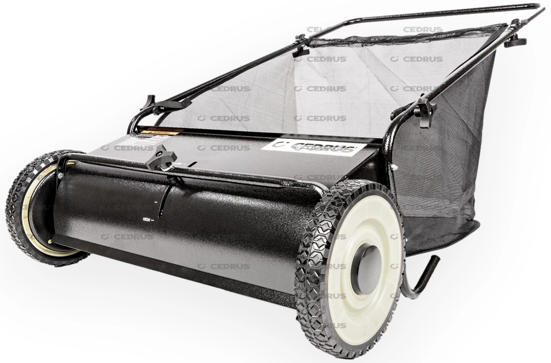Cedrus leaf collector is a solidly built device for collecting leaves and grass. Working width is 66 cm, capacity of durable bag 198l. The device has a drive shaft located on an axle terminated by two wheels. Can handle leaves, needles, small twigs, debris.