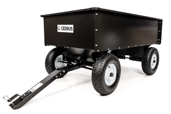 Cedrus SP 22103 also fits most garden tractors. The 2-axle Garden Tractor Trailer is a solidly built transport truck designed for transporting wood, coal, grass, garden soil, fertilizers, etc. It is a practical trailer that allows you to use the device as a tractor and transport various materials in the garden or on the plot, for example, sand, fertilizer and other things. The cart has a a load of as much as 900 kg and solid wheels, which provide the cart with excellent grip on the ground, even on sandy soil.Equipped with four large rubber wheels, it allows easy movement over uneven terrain, ensuring the stability of the transported load. In addition, the torsion front axle provides better maneuverability of the stroller, which in turn makes it easier to maneuver it.