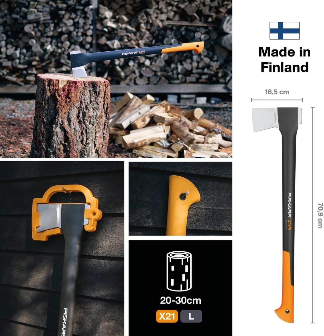 - Fiskars Axe X21 - L was designed for chopping and splitting medium-sized logs. It has a wedge-shaped blade.