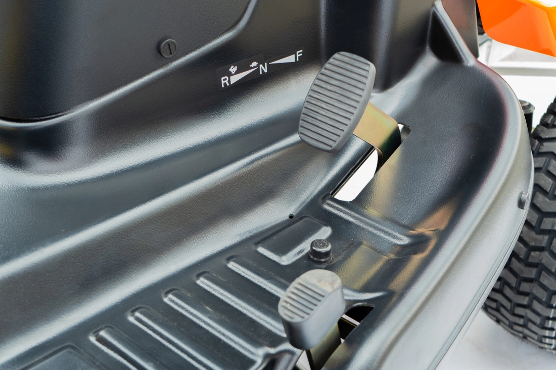 Hydro Gear pedal-operated hydrostatic transmission without having to take your hands off the wheel for greater machine control and safety.