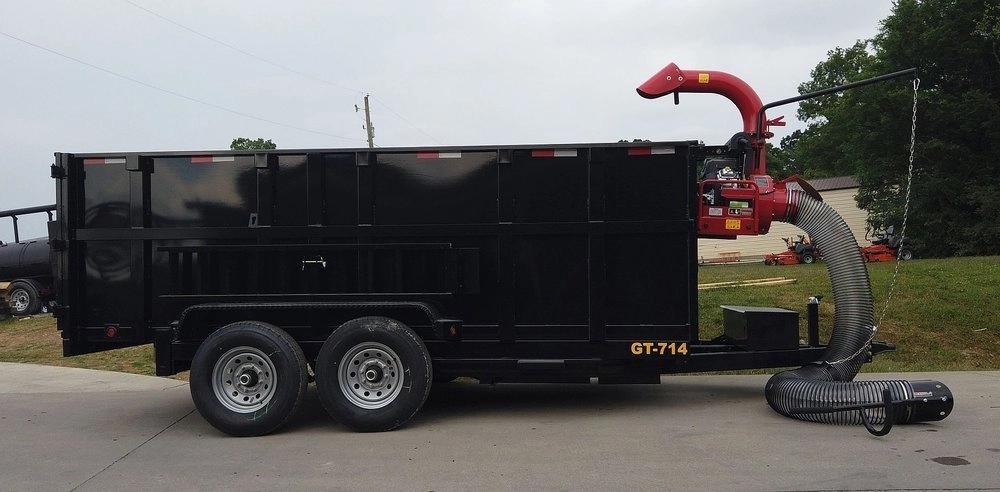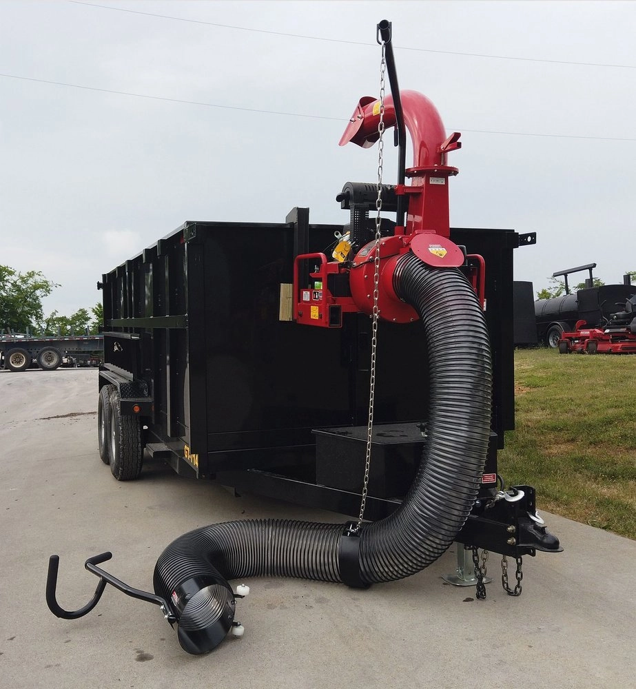 The ejection channel is obscured by a deflector shield, which reduces the spread of material collected on the trailer.