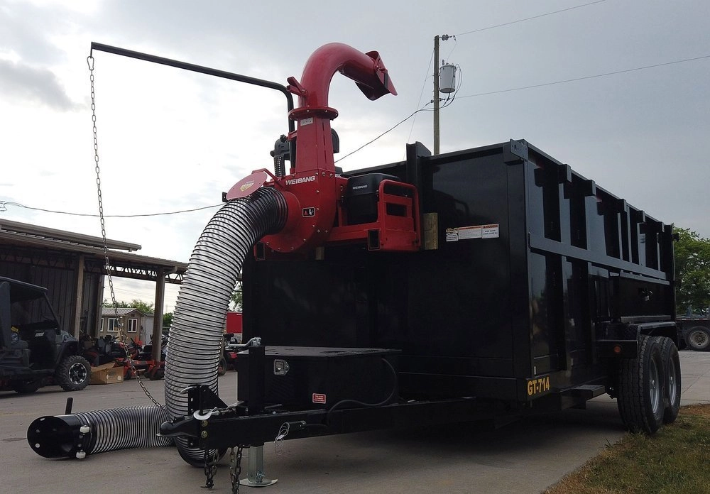 Professional powerful overboard vacuum cleaner Weibang WBDL5021R Pro. The machine is powered by a powerful 21 hp two-cylinder Rato engine, which will make cleaning up leaves and other waste extremely easy. The motor is powerful enough to easily pick up leaves, grass clippings, pine needles, mulch, small twigs, etc. A dedicated, branched grinding blade will effectively grind the material before it flies through the chimney. Adjustable ejection chimney in horizontal (360 degrees) and vertical (45 degrees) orientations allow you to precisely aim the trash into the truck bed or onto the trailer.