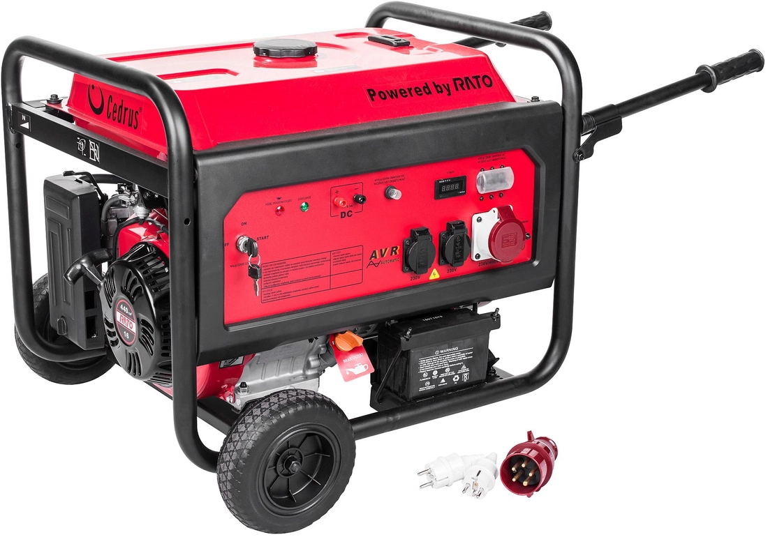 Cedrus AG7E-3F Cedrus generator set power 6800 W. Power generator with rato 16 hp engine with a capacity of 440 cc is equipped with an automatic low oil level detection system that shuts down the unit. The three-phase generator provides high power and 400V voltage. Our new units are designed for versatile use. We used in them reliable and proven Rato engines. Specially designed alternator with copper winding guarantees reliable operation. AVR system provides voltage stabilization, to protect powered loads from voltage fluctuations. Oil sensor will shut down the genset at low oil level protecting the engine from seizure. In addition, our units are equipped with circuit fuses.