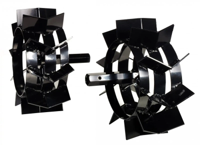 METAL WHEELS FOR MH175 ROTOVATOR 68209084 is a sturdy set of two steel working wheels, designed specifically for use with the soil tiller MH175. Replaces standard rubber wheels or work blades in situations where maximum traction, stability and full control of the machine are needed when working in difficult off-road conditions. Thanks to the massive design and toothed plates, the wheels bite into the ground, preventing slipping, burrowing of the machine and uneven handling.