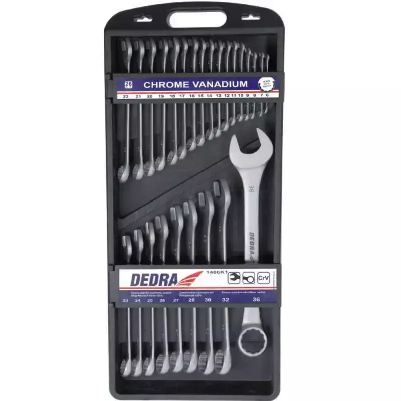 The 1406 wrench set includes 25 wrenches in popular sizes from 6 to 32. Wrenches made of CrV steel with satin-finished coating, which improves the grip of the wrench during operation. Wrench heads made with SUPER DRIVE BROACH technology - do not damage screws. Practical pouch for easy storage of keys.