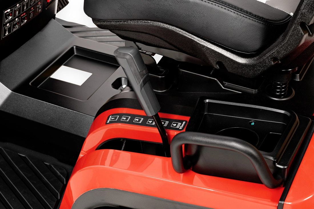 Operator comfort is influenced by an ergonomic steering wheel, a high-back seat and an intuitive multifunction display that conveys key information about the machine's operation. Front LED headlights with twilight sensor for safe mowing even in poor visibility. Practical additions to the equipment are handles on the fenders and a cup holder for added convenience during extended work.
