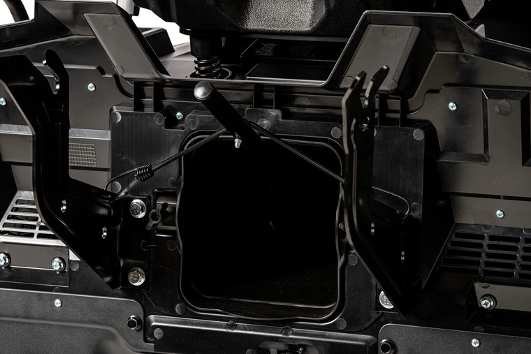 - Duży kosz 280l, opróżniany z pozycji operatora przy pomocy dźwigni.