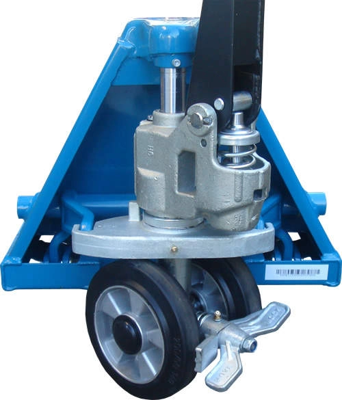 - Sterowanie rączką nawet do 190°, zaokrąglone końcówki wideł ułatwiające wjeżdżanie pod palety, przyjemny pokryty gumą dyszel