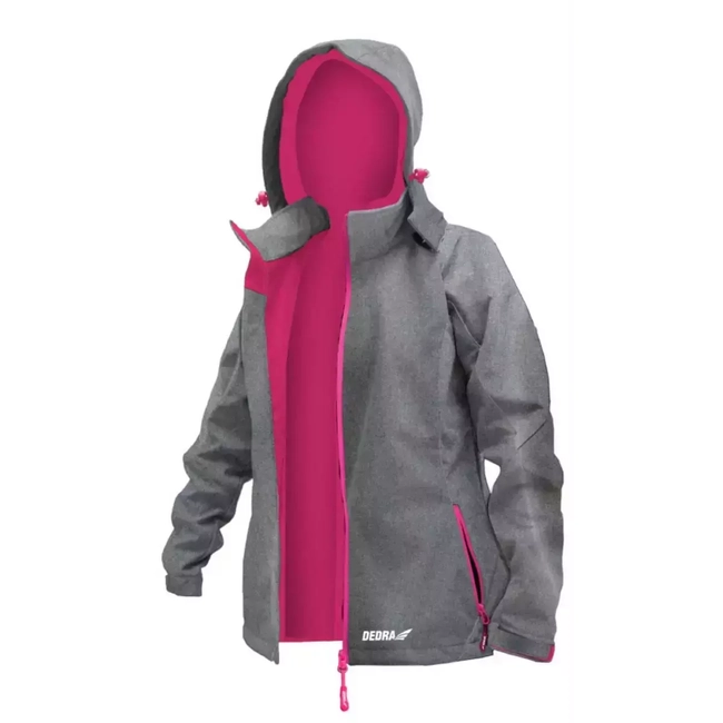 Kurtka damska z kapturem wykonana z materiału typu soft-shell z membraną TPU. Membrana zapewnia wiatroszczelność, wodoodporność na poziomie 5000 mm oraz oddychalność 800 g/m²/24h(mpv) przy gramaturze 310g/m². Kurtka posiada podszewkę z mikropolaru w kolorze różowym.Dwie kieszenie zapinane na wodoodporny zamek błyskawiczny. Kaptur z troczkami odpinany na zamek błyskawiczny. Mankiety zapinane na rzep oraz taliowanie w pasie pozwolą idealnie dopasować kurtkę. Zapinana na zamek błyskawiczny. Dostępne rozmiary od XS do XXL
