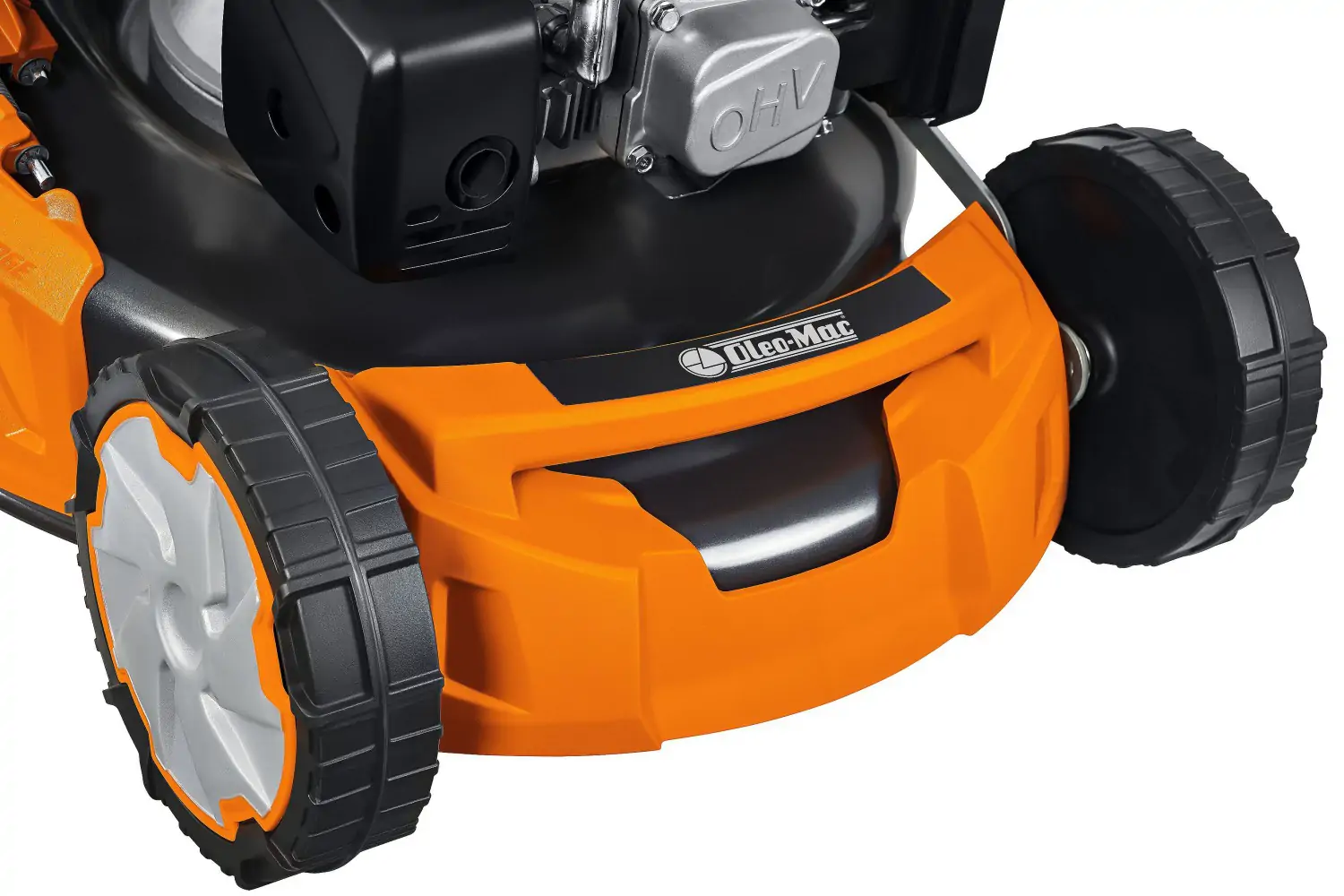 - Duże koła 200 mm (przednie) i 280 mm (tylne) na łożyskach kulkowych gwarantują płynną jazdę, większą zwrotność oraz łatwe manewrowanie nawet na nierównych i miękkich terenach. Bieżnik kół zapewnia dobrą przyczepność, co przekłada się na stabilną pracę kosiarki.