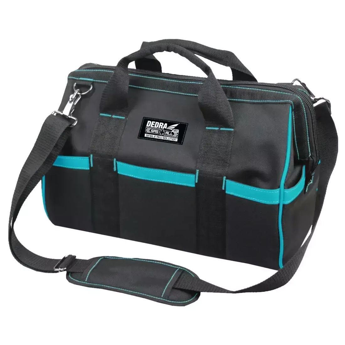 W zestawie znajduje się pojemna torba narzędziowa DED7001 o pojemności 24 litrów, wykonana z wytrzymałego, nieprzemakalnego poliestru 600D. Dzięki dwuwarstwowej konstrukcji zapewnia ochronę przed uszkodzeniami mechanicznymi oraz warunkami atmosferycznymi. Torba wyposażona jest w regulowany pas naramienny oraz solidny zamek błyskawiczny, co gwarantuje komfort i bezpieczeństwo podczas transportu narzędzi na miejsce pracy.