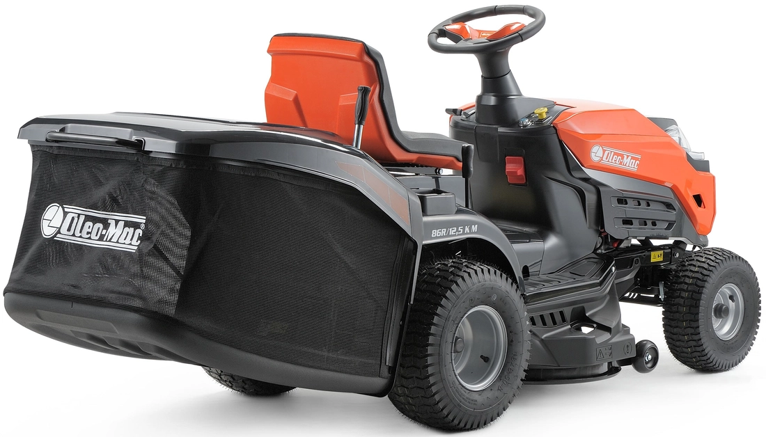 Dodatkowo kółka na urządzeniu tnącym zostały zaprojektowane w ten sposób aby zapobiec skalpowaniu trawnika nawet w wilgotnych warunkach. Kolejną bardzo pozytywną zaletą wprowadzoną do traktora jest to, że wysokość koszenia można swobodnie regulować w aż 7 pozycjach w zakresie od 25 do 80 mm za pomocą dźwigni umiejscowionej obok fotela, oszczędzając w ten sposób  czas i wysiłek. Ten uniwersalny traktor ogrodowy Oleo-Mac OM 86R/12.5 KM wyposażony został w niezawodny jednocylindrowy silnik Emak K1250 AVD o pojemności 414 cm3 i ogromnej mocy 12,5 KM. Silnik ten gwarantuje optymalne osiągi i długą autonomię pracy dzięki pojemnemu zbiornikowi paliwa. Ponadto w traktorze zastosowano bezawaryjną przekładnię manualną. Łatwa w obsłudze i bezpieczna w prowadzeniu - te pochyłe ogrody nie będą już dłużej wyzwaniem. Energooszczędne reflektory z przodu kosiarki to kolejna przydatna funkcja, która sprawdzi się o każdej porze dnia. Natomiast praktyczne złącze myjące pozwoli Ci po każdym koszeniu na szybkie i proste usunięcie zanieczyszczeń z okolic agregatu tnącego.