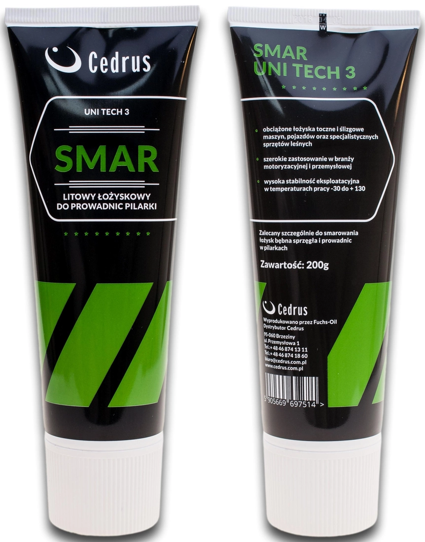• CEDRUS UNI TECH 3 SMAR LITOWY ŁOŻYSKOWY DO SMAROWANIA ŁOŻYSK I PROWADNIC Produkt przeznaczony jest między innymi do smarowania łożyska zębatki prowadnic pilarek spalinowych i elektrycznych. Regularne smarowanie zwiększa żywotność prowadnicy