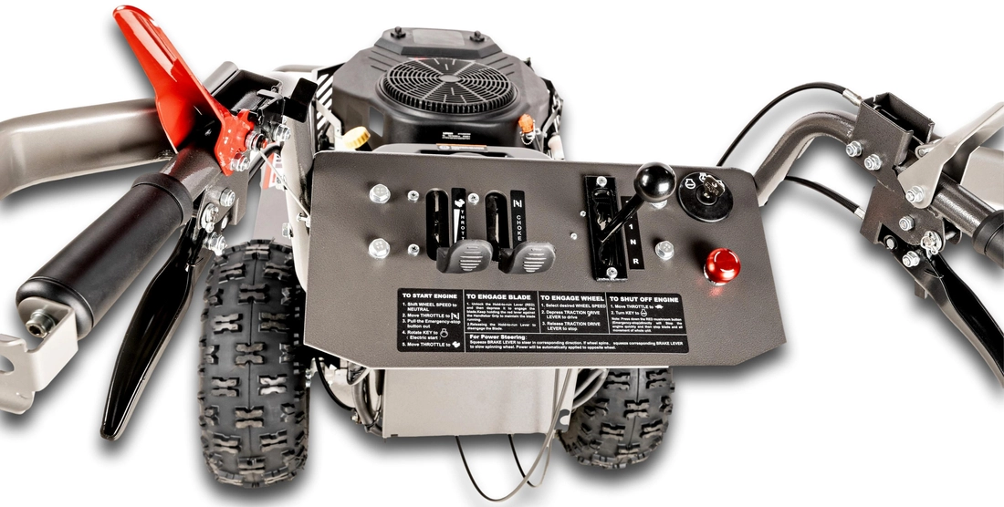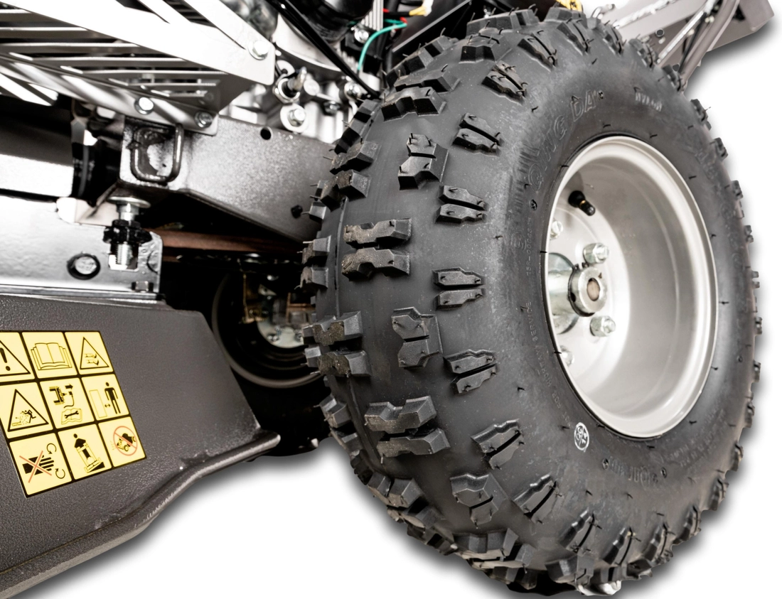 • Kosiarki posiadają również odporne na przebicie opony, w tym duże 18-calowe koła terenowe z bieżnikiem o dużej przyczepności, odpowiednim do jazdy w zróżnicowanym terenie. Opony te są wypełnione uszczelniaczem, skutecznie eliminującym ryzyko przebicia podczas poruszania się w trudnych i trudnych warunkach.