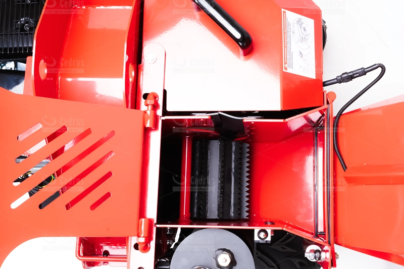 CEDRUS RB05PRO-HE jest to maszyna z hydraulicznym podajnikiem gałęzi. Za podawanie gałęzi odpowiada walec z zębami napędzany za pomocą pompy hydraulicznej. Za pomocą dźwigni możesz zmieniać kierunek obrotu tego walca lub go zatrzymać czyli możesz cofnąć gałąź od noży. Prędkość podawania czyli obrotu tego walca też jest regulowana. To rozwiązanie jest szczególnie przydatne przy rozgałęzionych konarach, gałęziach z kolcami, cierniami itd.   Układ tnący to nie tylko dwa stałe noże na tarczy, ale także noże rozdrabniające jest ich 10 szt. Gałęzie podawane są na 2 ostrza (oraz nóż kontrujący), które wstępnie tną materiał. Następnie ścinki trafiają na system 10 ostrzy na tarczy tnącej, które rozdrabniają materiał do zadanej wielkości.   Układ hydrauliczny ma pojemność 4l. Silnik Loncin G420F z rozruchem na kluczyk.