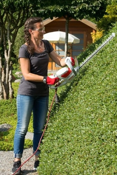 Elektrycznymi nożycami do żywopłotu można sprawnie pracować w ciągły sposób ponieważ energia jest w ciągły sposób dostarczana z gniazdka elektrycznego. Dzięki zewnętrznemu źródłu energii nożyce elektryczne są wyraźnie lżejsze od nożyc spalinowych. Energia dostarczana z gniazdka oznacza także, że nie musisz zwracać uwagi na czas ładowania akumulatora. Nie powstaną też przerwy w pracy spowodowane napełnianiem zbiornika i przygotowywaniem mieszanki. Elektryczne nożyce do żywopłotu IHT 550 posiadają metalową przekładnię co zapewnia niezawodność i trwałość urządzenia. W przypadku żywopłotów rosnących przy murze nie musisz się martwić, że uderzenie końcówką ostrzy w mur uszkodzi nożyce, ponieważ zostały one wyposażone w osłonę ostrzy zamontowana na ich końcówce. Dzięki temu dotkniecie muru końcówką ostrzy ich nie uszkodzi oraz zapobiega to odbiciu nożyc przez poruszające się ostrza. Osłona końcówki ostrzy pełni 3 ważne funkcje: chroni operatora przed odbiciem nożyc, chroni ostrza przedzniszczeniem oraz chroni mur przed uszkodzeniem.