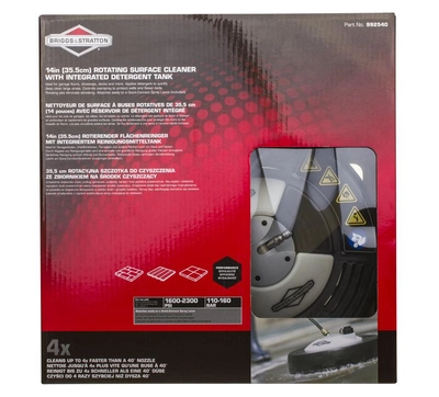 Profesjonalny, oryginalny czyścik powierzchni 14" (35 cm) do myjek elektrycznych Briggs & Stratton z serii Sprint. Zintegrowany zbiornik na detergent 473 ml, stabilna osłona i rotacyjne dysze gwarantują szybkie, równe i bezpieczne czyszczenie tarasów, podjazdów oraz kostki brukowej – bez rozprysków i smug. Oznaczenie producenta: 992540, EAN: 4016153567785.