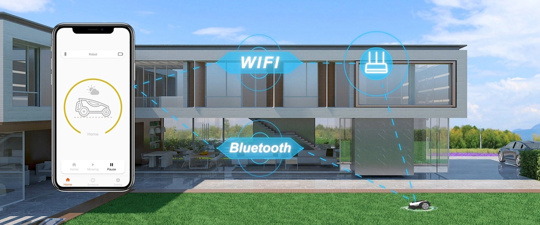 Wszystkie nasze kosiarki wyposażone są w Bluetooth oraz Wifi. Po podłączeniu kosiarki do domowego Wifi możesz mieć nad nią kontrolę z każdego miejsca na świecie.