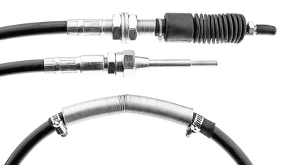 - Budowa: stalowa linka w elastycznym pancerzu, końcówki z gwintem i nakrętkami kontrującymi do regulacji.