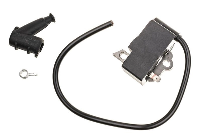 Moduł zapłonowy (cewka zapłonowa z przewodem WN) to serce układu zapłonowego Twojej przecinarki. Odbiera impuls z magnesów koła zamachowego i w odpowiednim momencie generuje wysokie napięcie, które tworzy iskrę na świecy zapłonowej. To od niego zależy łatwość rozruchu, kultura pracy silnika oraz pełna moc pod obciążeniem.