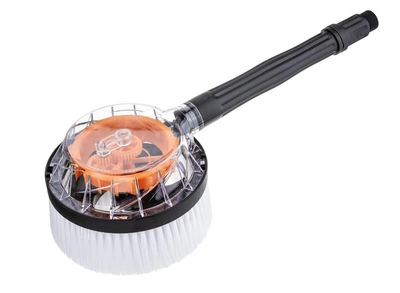 To końcówka czyszcząca z przekładnią napędzaną przepływem wody z myjki. Włosie obraca się, delikatnie odspajając brud, a jednoczesny przepływ wody wypłukuje zanieczyszczenia. Transparentna obudowa części napędowej pozwala kontrolować pracę mechanizmu, a ergonomiczny, ryflowany uchwyt poprawia chwyt nawet w mokrych rękawicach.