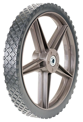 Koło jezdne jest wykonane z wysokiej jakości, odpornego na uderzenia tworzywa o wzmocnionej konstrukcji oraz trwałej opony z wyraźnym bieżnikiem. Pięcioramienna obręcz zwiększa sztywność koła i stabilnie przenosi obciążenia z maszyny na podłoże, co jest szczególnie ważne podczas pracy na nierównych, trawiastych i żwirowych powierzchniach. Centralnie umieszczone łożysko gwarantuje lekkie toczenie i ogranicza opory ruchu.