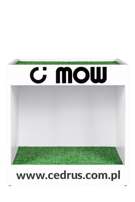 - Wykończenie: kolor biały z nadrukiem logo C‑MOW i Cedrus, powierzchnie ekspozycyjne pokryte zieloną wykładziną imitującą trawnik