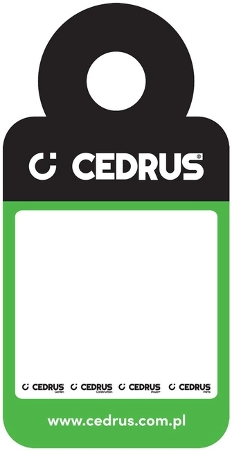 Zawieszka towarowa Cedrus Garden REKL00233 to sztywna, jednostronnie zadrukowana etykieta ekspozycyjna z charakterystycznym otworem montażowym w górnej części. Górna część zawieszki w kolorze czarnym prezentuje wyraźne logo Cedrus, dzięki czemu klient już z daleka wie, że ma do czynienia z produktami tej marki. Dolna, zielona ramka z dużym, białym polem roboczym daje miejsce na czytelny, własnoręczny lub wydrukowany opis.