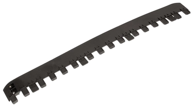 Grzebień osłony Weibang LT56AB15000 montowany jest na dolnej krawędzi przedniej części osłony roboczej kosiarki żyłkowej Weibang WBLT567SLC. W praktyce znajduje się tuż przed strefą, w której obraca się głowica żyłkowa. Zęby grzebienia wystają ku dołowi i do przodu, tworząc równą linię prowadzącą dla wysokiej trawy i chwastów.