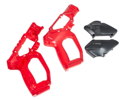 - dwóch połówek czerwonego korpusu pistoletu myjki – tworzących ergonomiczną rękojeść oraz uchwyt roboczy,