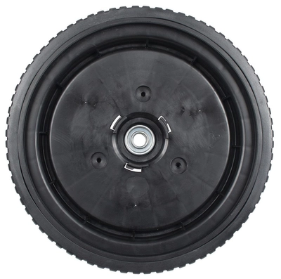 Koło zostało wykonane z wysokogatunkowego tworzywa odpornego na uderzenia, ścieranie i działanie wilgoci. W jego centrum znajduje się łożysko kulkowe, które minimalizuje opory toczenia, ułatwia manewrowanie kosiarką oraz zmniejsza zużycie pozostałych elementów napędu. Odpowiednio zaprojektowana wewnętrzna konstrukcja wzmacniająca zapewnia sztywność koła i zapobiega jego odkształceniom pod obciążeniem.