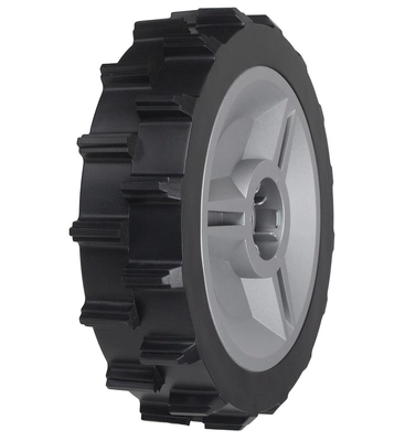 Koło współpracuje z fabrycznym mechanizmem napędowym robota. Odpowiada za przeniesienie momentu obrotowego z silnika na podłoże, dzięki czemu kosiarka może poruszać się po trawniku, pokonywać niewielkie nierówności, podjazdy, a także utrzymać stabilność w ciasnych zakrętach i wzdłuż krawędzi trawnika.