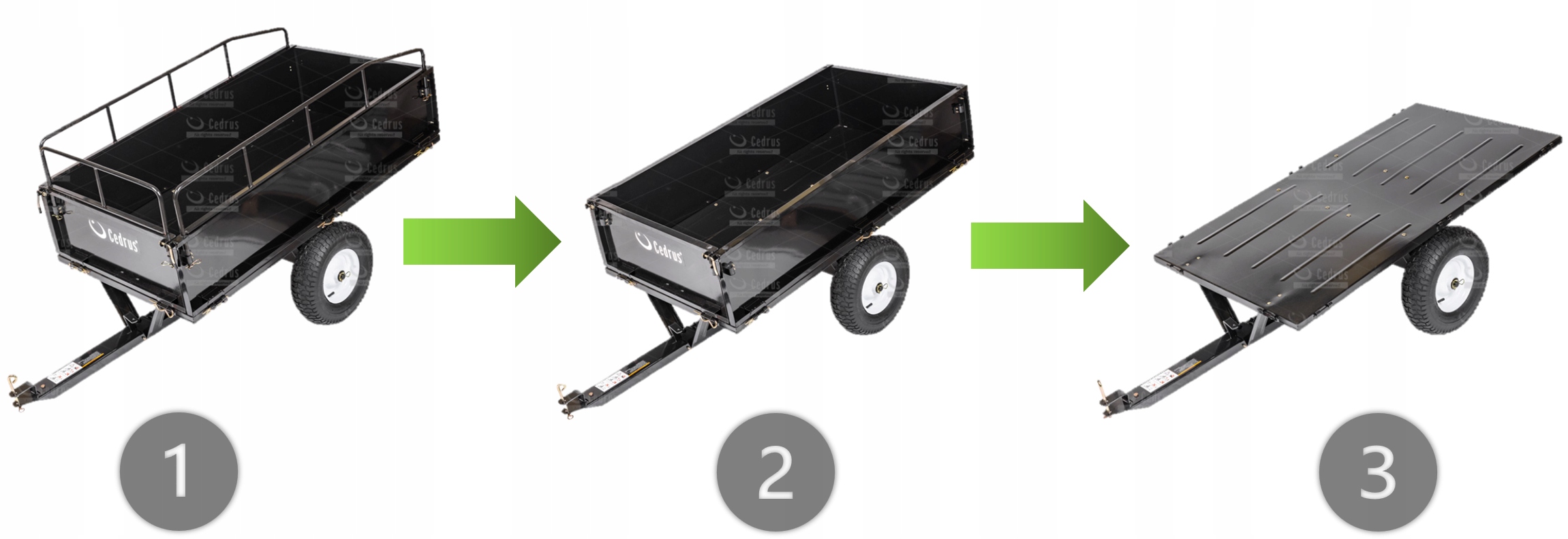 - Dodatkowe zalety: funkcja wywrotu, zdejmowana tylna burta, pompowane koła, malowana proszkowo, Nadstawki