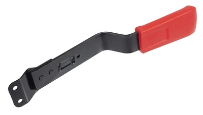 Prezentowany element został wykonany z wytrzymałej stali, zabezpieczonej powłoką lakierniczą w kolorze czarnym, co chroni przed korozją i uszkodzeniami mechanicznymi. Czerwony uchwyt z tworzywa o ergonomicznym kształcie zapewnia komfort trzymania nawet w rękawicach roboczych oraz ułatwia znalezienie dźwigni podczas pracy w gęstej trawie.